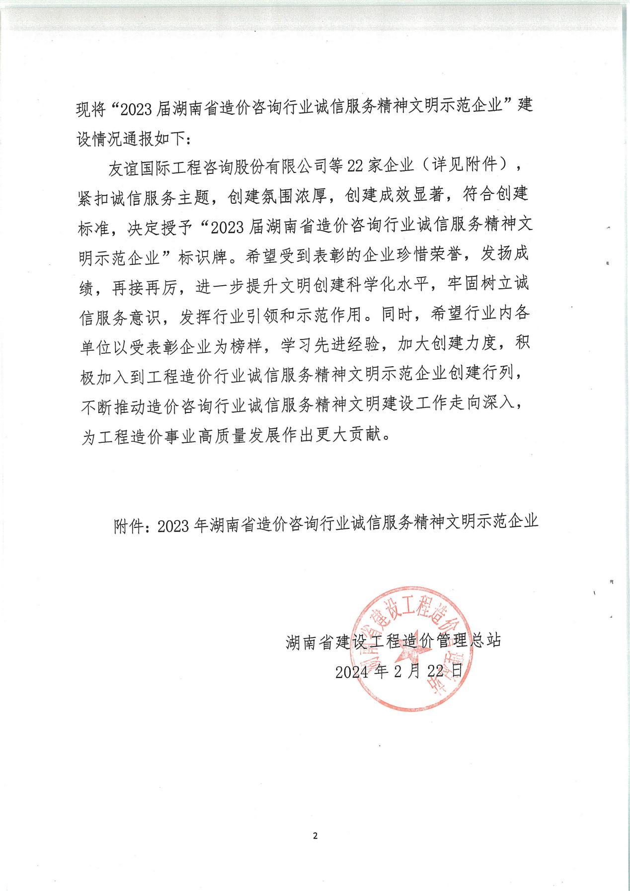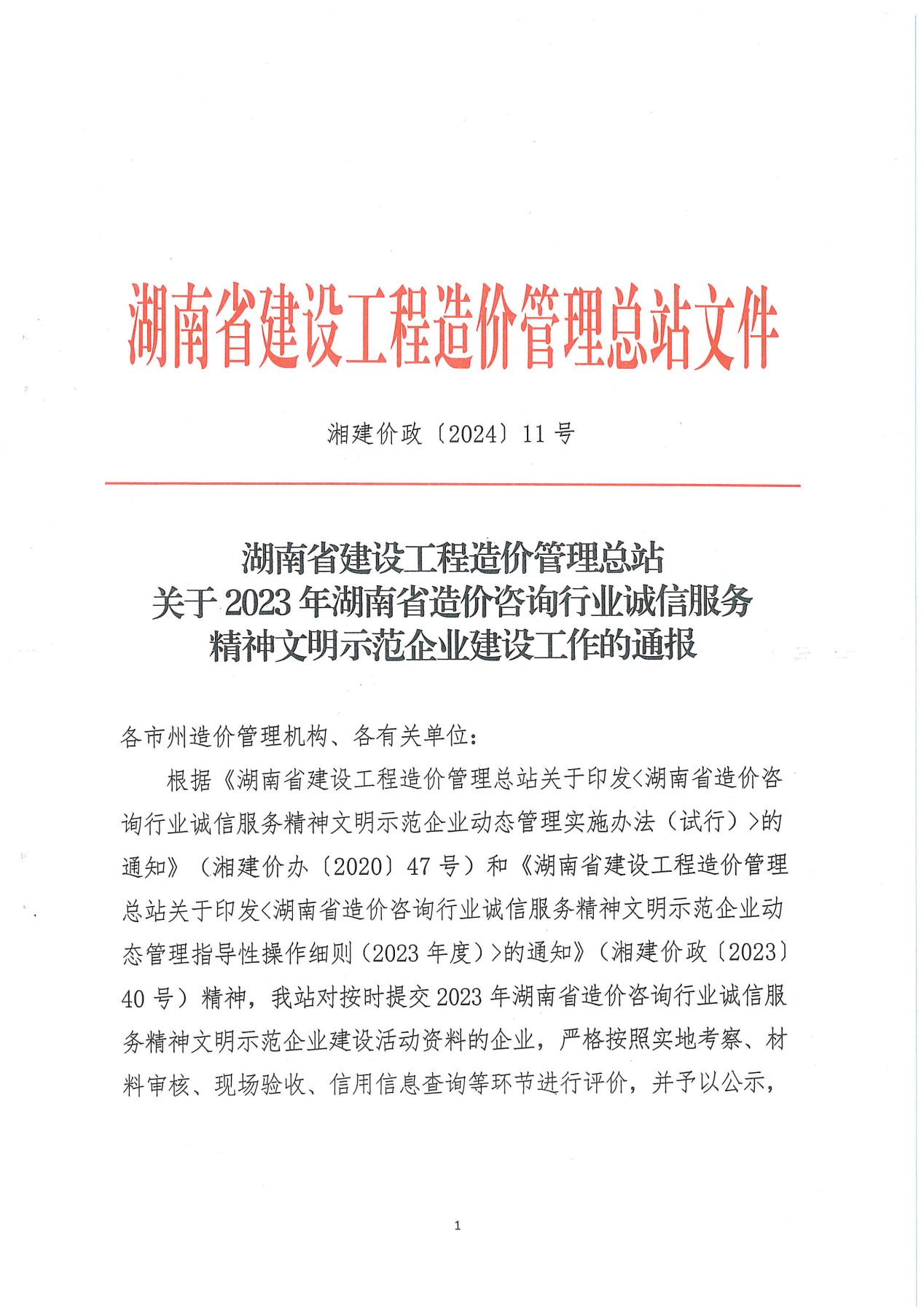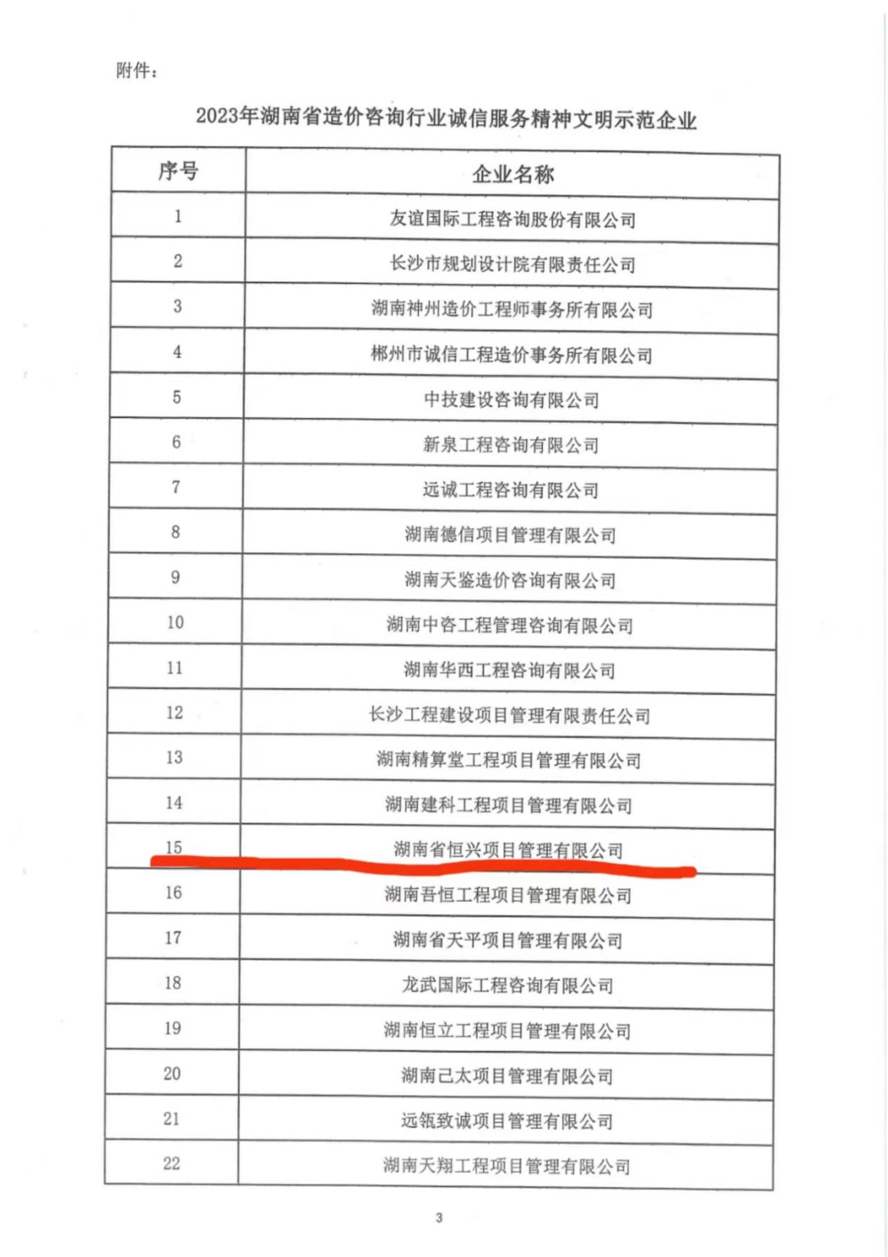 湖南省建设工程造价管理总站湘建价政〔2024〕11号文《关于2023年湖南省造价咨询行业诚信服务精神文明示范企业建设工作的通报》,湖南省恒兴项目管理有限公司被评为“2023届湖南省造价咨询行业诚信服务精神文明示范企业”。