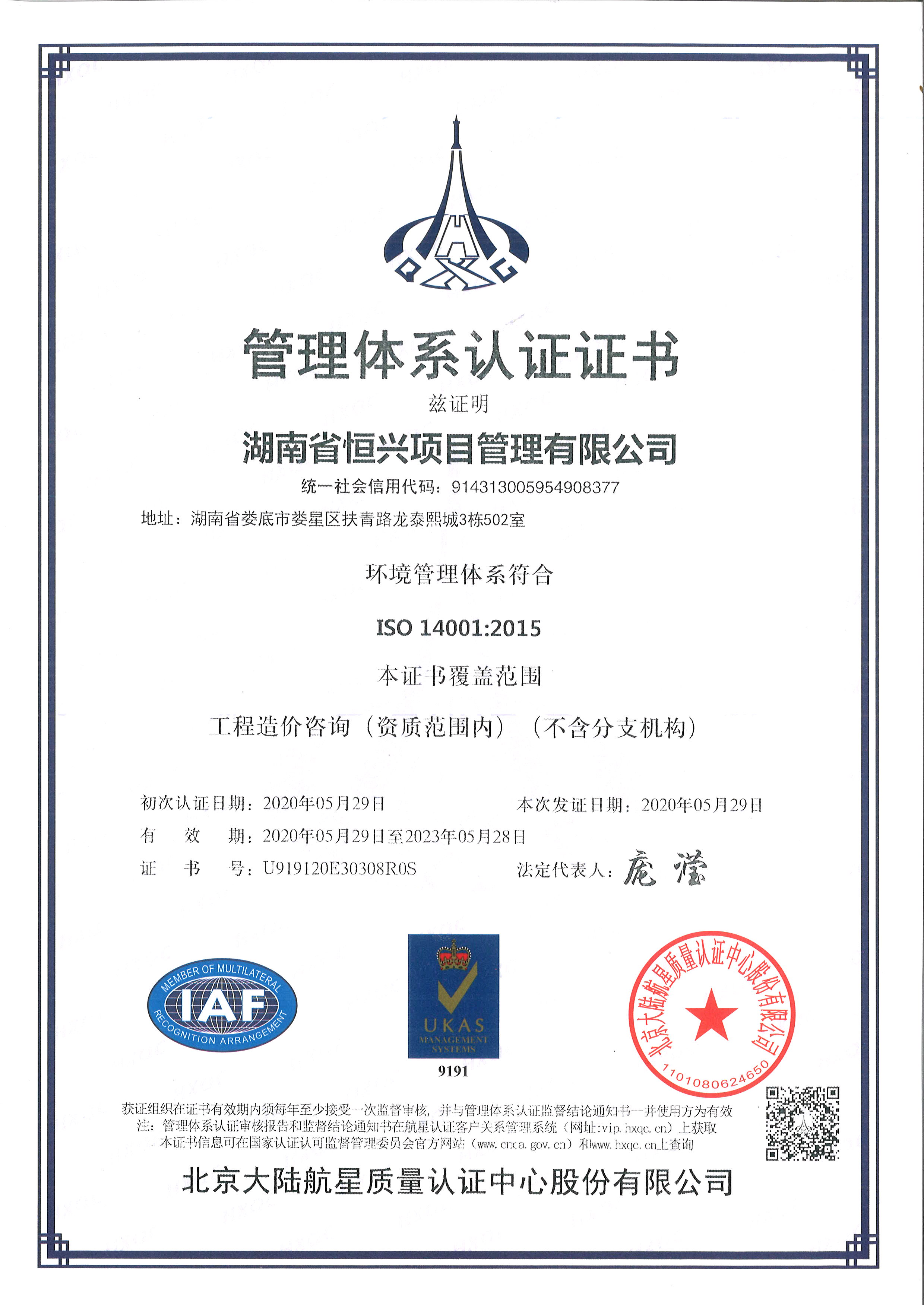 环境管理体系认证证书